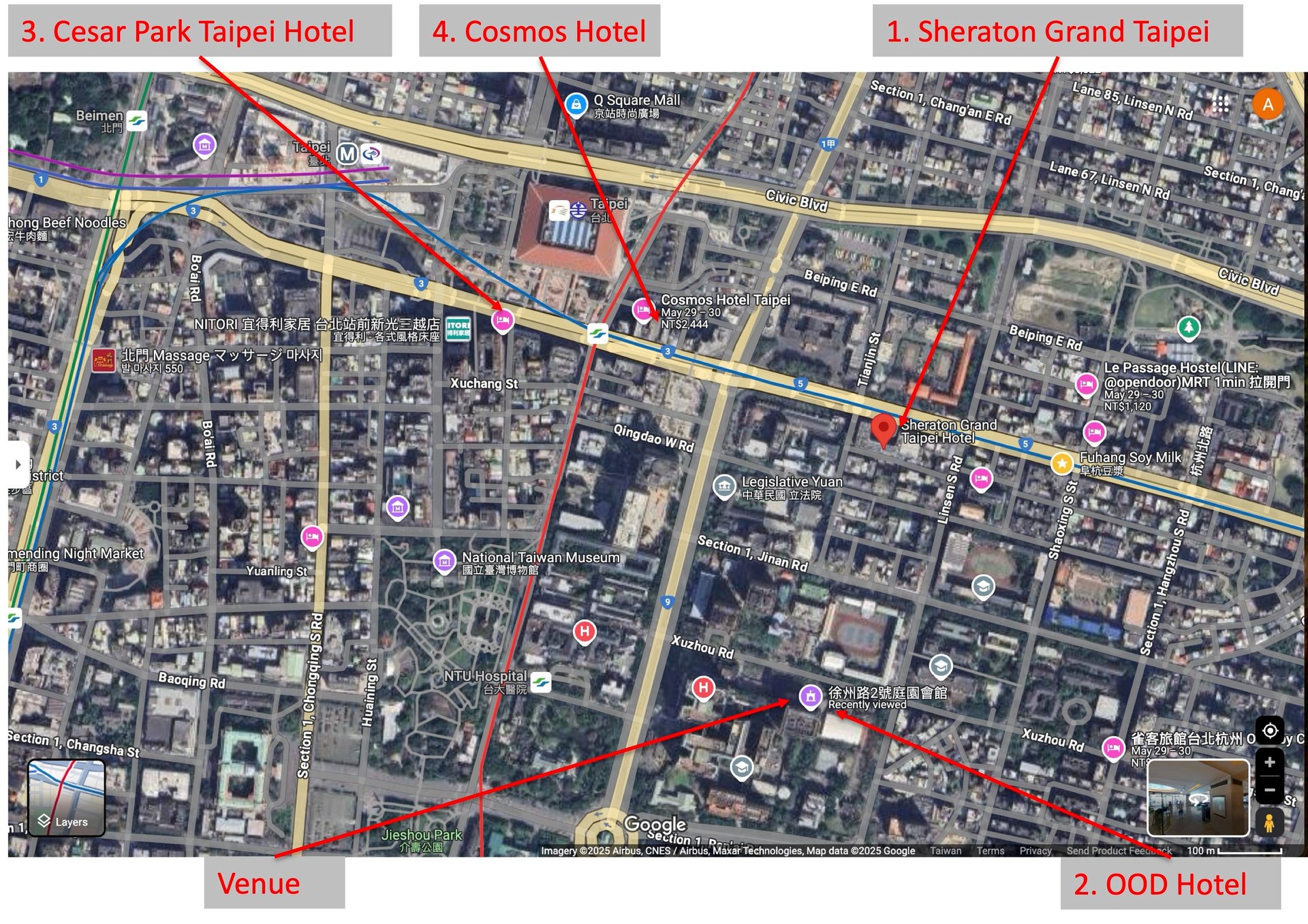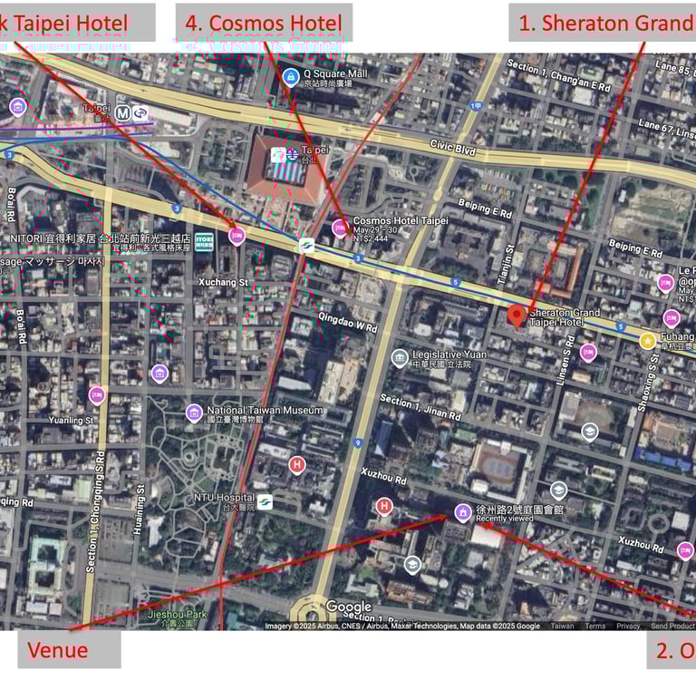 The conference venue is located near Taipei Main Station. There are many hotels available. We list a few that are convenient near by.